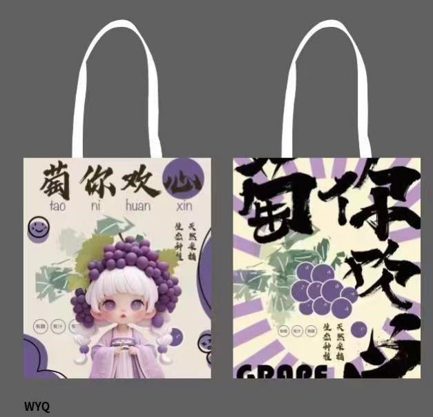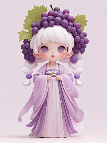 该形象头戴饱满的葡萄与绿叶发饰,蓬松白发点缀葡萄造型装饰,紫色眼眸懵懂软萌,身着浅紫渐变古风长裙,既融合了涿鹿龙眼葡萄的文化内核,又契合当下年轻人喜爱的国潮风格,可爱亲切且易于传播。围绕这一IP,团队开发了一系列文创产品,有效增强了品牌辨识度与文化感染力,为后续带动商业旅游发展奠定了基础。